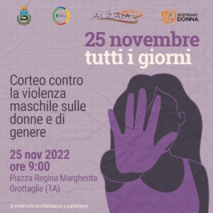 Quest’anno, in occasione del 25 novembre, data in cui ricorre la Giornata Internazionale contro la Violenza sulle Donne, l’Associazione Alzàia Onlus ETS, in collaborazione con l’Assessorato alle Politiche Sociali del Comune di Grottaglie ha organizzato il Corteo 25 novembre tutti i giorni.