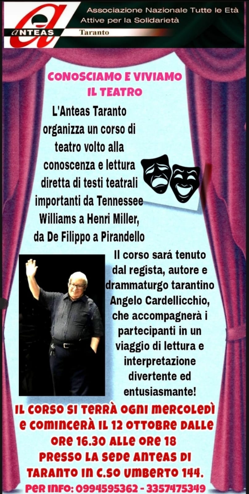 Le lezioni della durata di h. 1:30, dalle 16:30 alle 18:00 saranno tenute dal regista, autore ed attore Angelo Cardellicchio, si terranno ogni mercoledì.