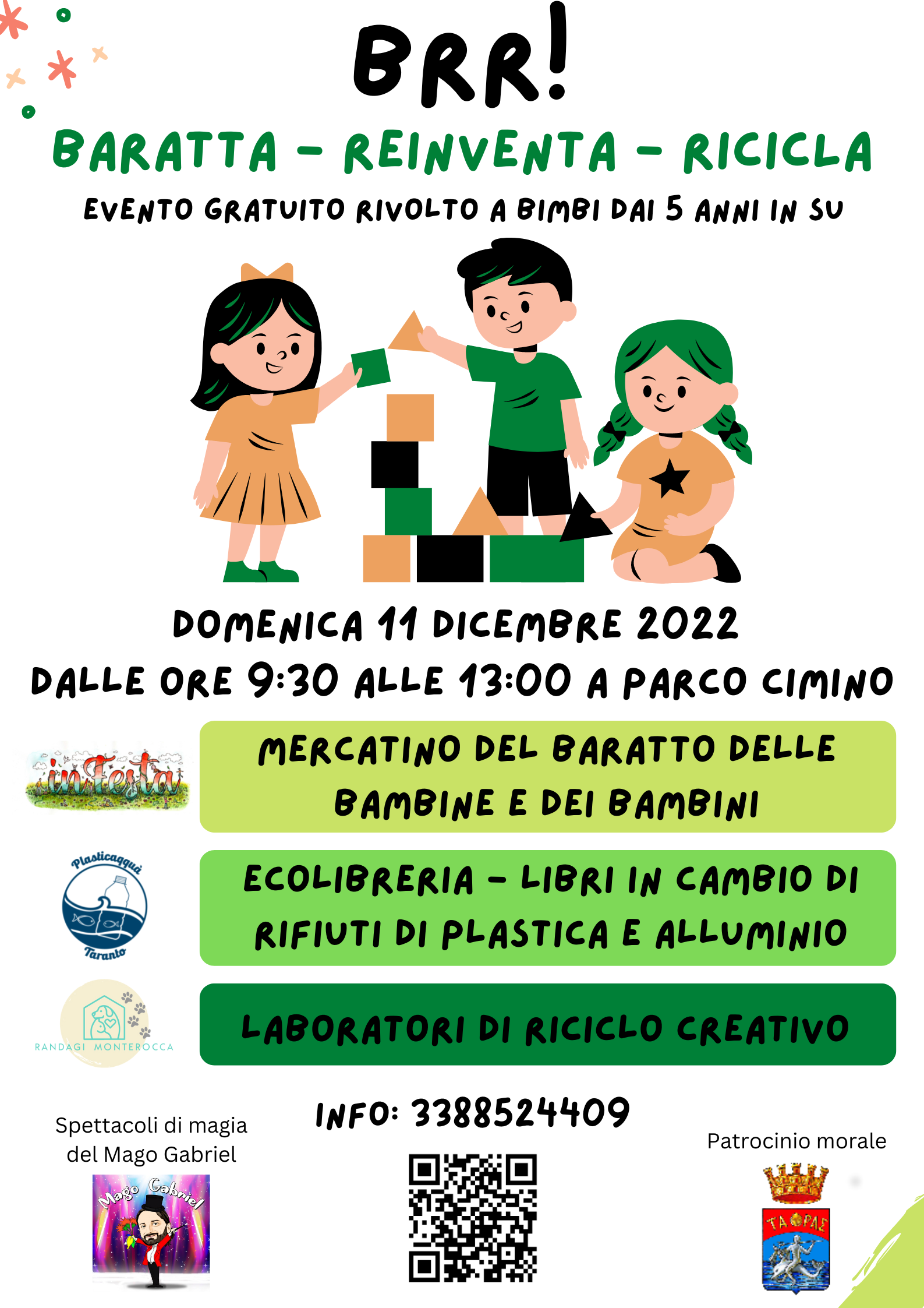 Si svolgerà domenica 11 dicembre dalle ore 09:30 alle 13:00 presso il Parco Cimino l’evento gratuito, patrocinato dal Comune di Taranto, dedicato ai bimbi dai 5 anni dal titolo BRR! Baratta reinventa e Ricicla.