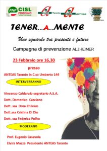 Giovedì’ 23 febbraio, presso la sede dell’Anteas di Taranto in Cso. Umberto 144, si terrà un incontro con esperti e medici dell’Associazione A.S.A. ( Alzheimer Salute e Architettura) che affronteranno il grave tema delle malattie neurodegenerative e le nuove frontiere della scienza in materia.