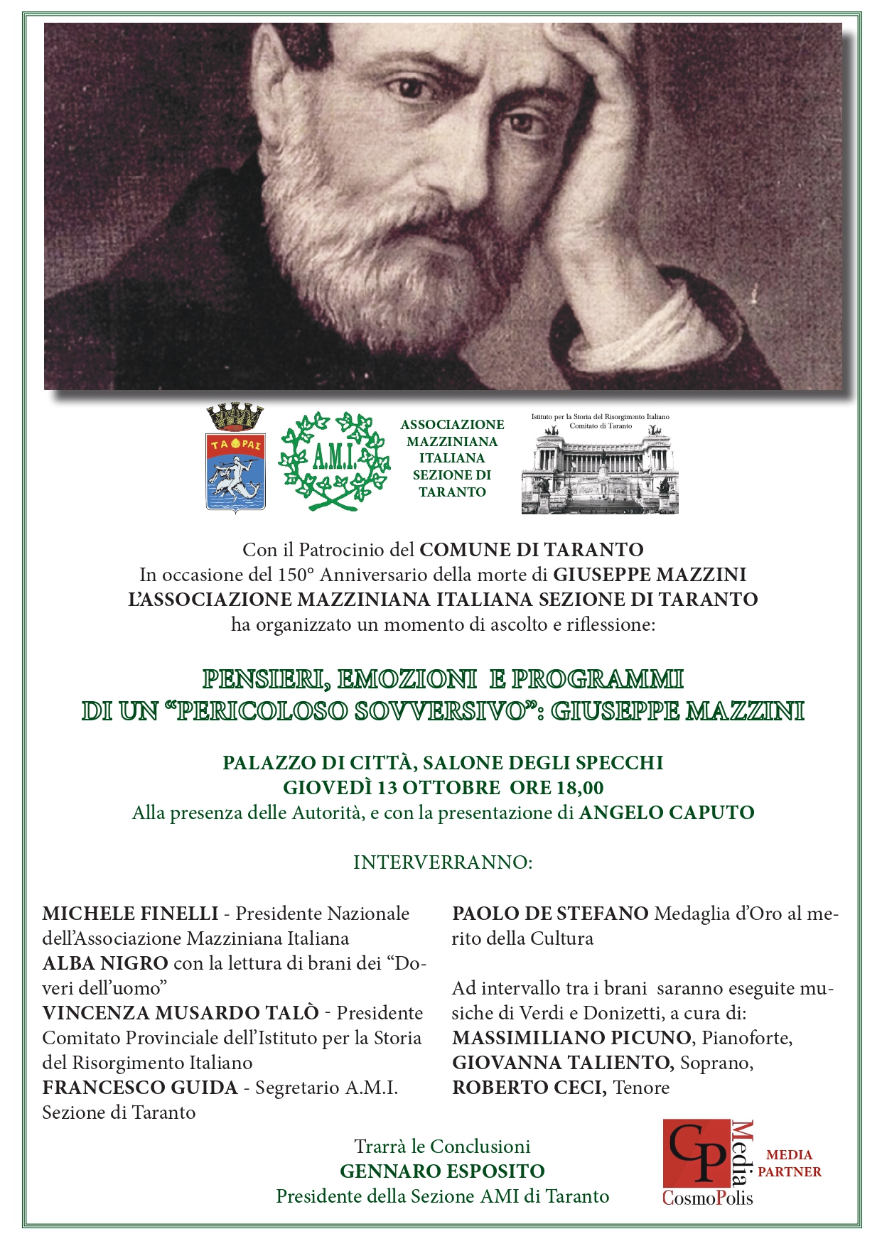 In occasione del 150^ anniversario della scomparsa di Giuseppe Mazzini la sezione di Taranto dell’Associazione Mazziniana Italiana organizza per giovedì 13 ottobre alle ore 18:00 nel Salone degli Specchi di Palazzo di Città una conversazione-concerto dl titolo Pensieri, emozioni e programmi di un “pericoloso sovversivo”: Giuseppe Mazzini.