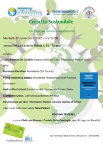 E’ stato rinviato il percorso Crescita sostenibile, che prevedeva come descritto di seguito due momenti nella giornata del prossimo 29 novembre, promosso da Movimento Shalom, Luogo dei Possibili e Federconsumatori provinciale di Taranto, nell’ambito delle “Idee di rete per … promuovere il volontariato 2022” dal Centro Servizi Volontariato della provincia di Taranto – CSV Taranto ETS.