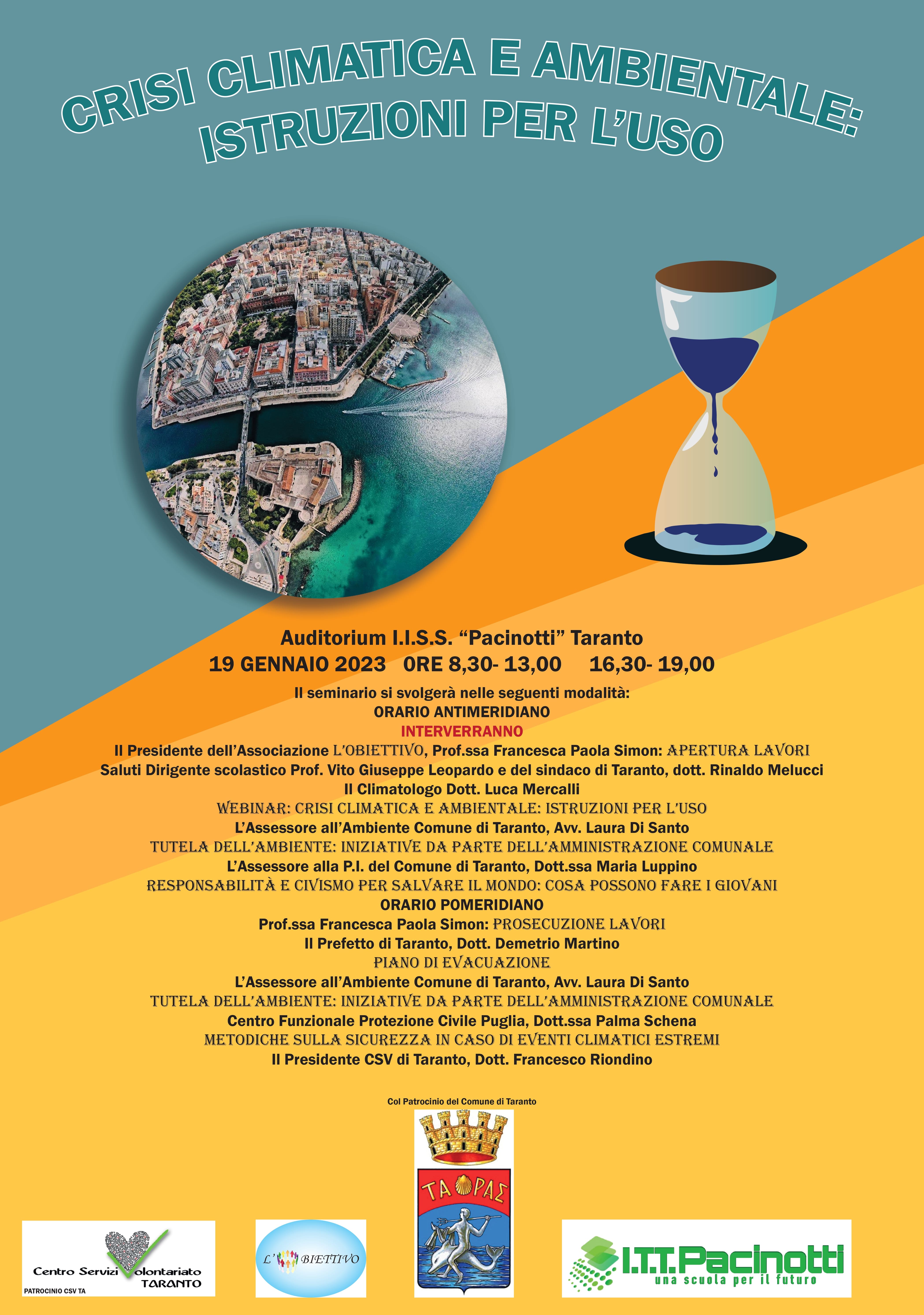 Si terrà giovedì 19 gennaio p.v. presso l’Auditorium I.I.S.S. “Pacinotti” di Taranto il Seminario sul tema Crisi climatica e ambientale: istruzioni per l’uso promosso dall’Associazione Socio Culturale L’Obiettivo con il patrocinio del CSV Taranto – ETS, previsto a dicembre 2022 ma poi rimandato.