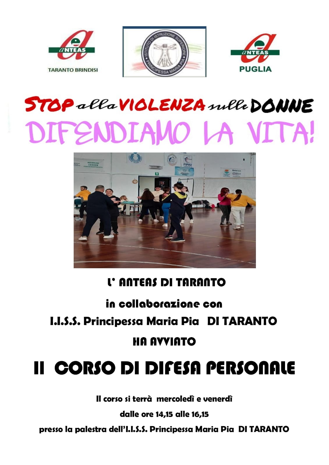 L’ANTEAS (Associazione Nazionale Tutte le Età Attive per la Solidarietà), con sede a Taranto in Corso Umberto I n.144, nell’ambito del Progetto regionale: “La Puglia con le donne”, ha proposto al Dirigente Scolastico dell’ I.I.S.S. “ Principessa Maria Pia”, prof.ssa Giovanna Santoro, un progetto di difesa personale, denominato: Difendiamoci Insieme, rivolto ad un gruppo di giovani alunni dell’Istituto.