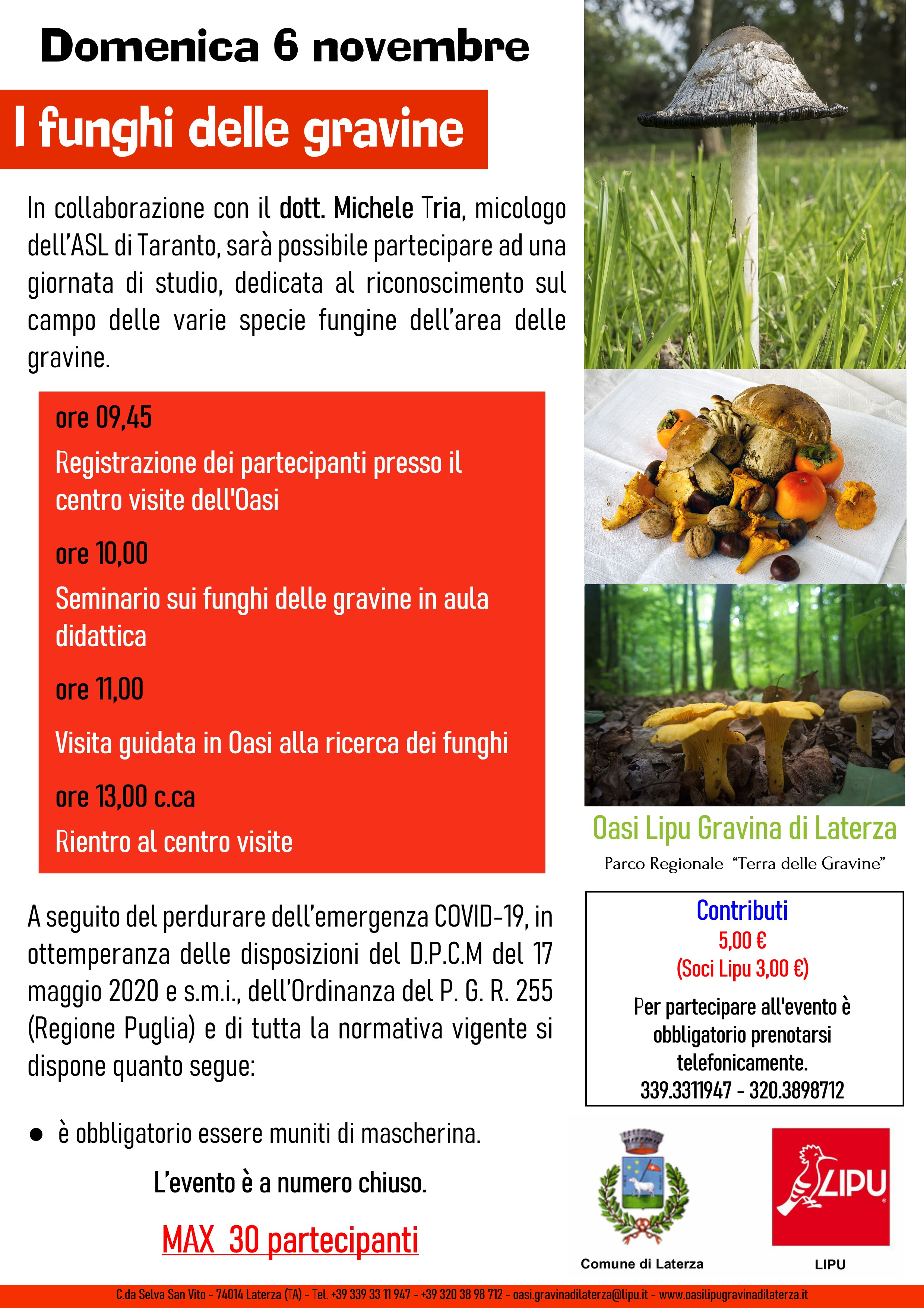 Nell’ambito del programma Eventi-Natura 2022 dell’Oasi Lipu Gravina di Laterza – realizzato grazie al contributo del Comune di Laterza – domenica 6 novembre, alle ore 09.45, si terrà l’evento I funghi delle gravine.