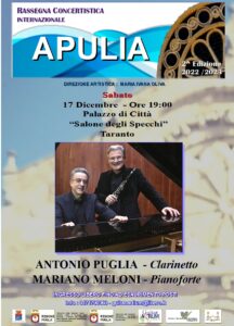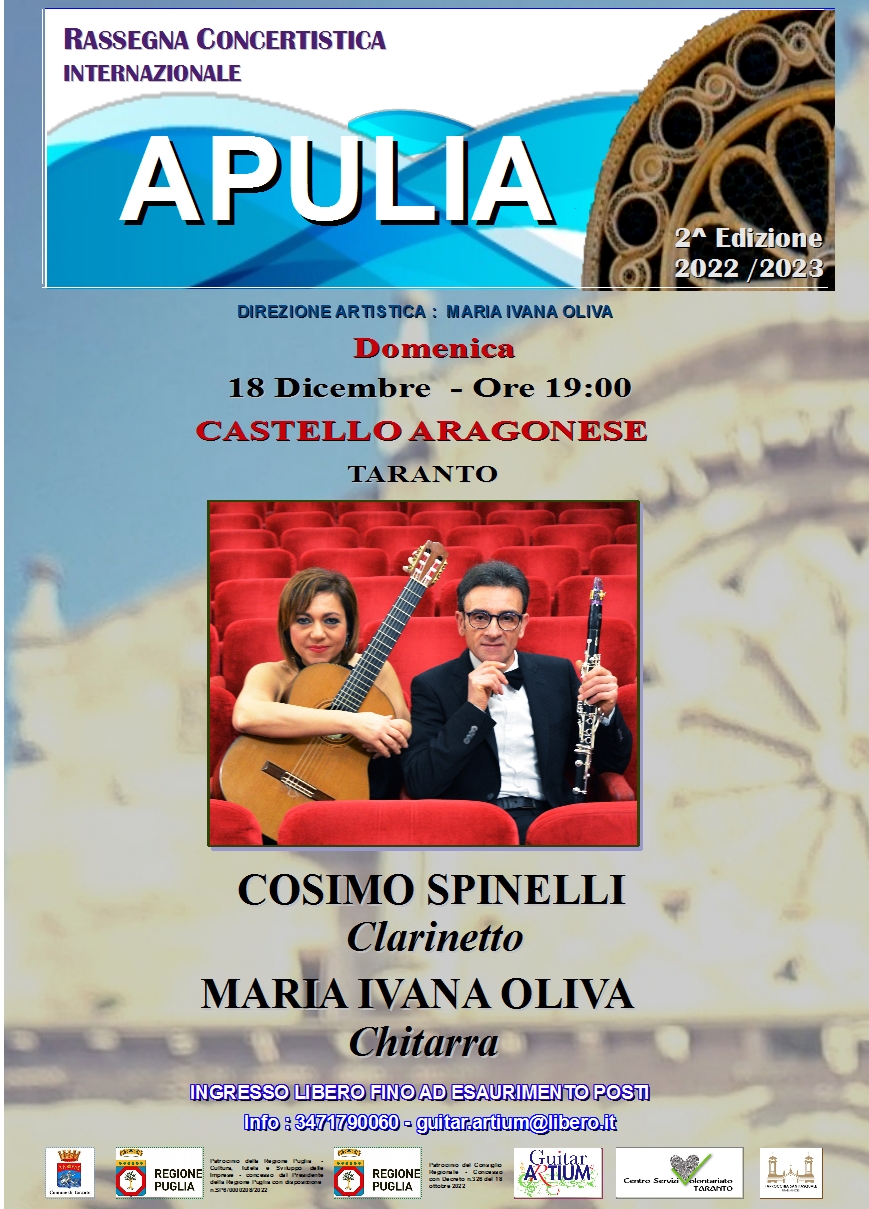 I prossimi appuntamenti nell’ambito della seconda edizione della Rassegna Concertistica Internazionale “Apulia” organizzata dall’ Associazione “Guitar Artium” e patrocinata da Comune di Taranto, Regione Puglia (Presidenza e Assessorato al Turismo) e C.S.V. Taranto – ETS sono previsti per domani, sabato 17 e domenica 18 dicembre.