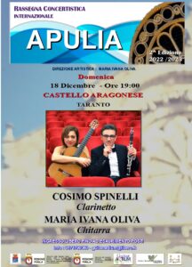 Il secondo appuntamento domenica 18 dicembre alle ore 19.00 presso il Castello Aragonese con il “Concerto di Natale”. Di scena il duo formato da Cosimo Spinelli – clarinetto e Maria Ivana Oliva – chitarra