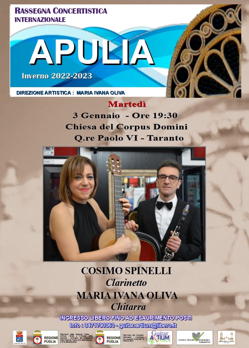 Si parte martedì 3 gennaio alle ore 19.30 presso la Chiesa Corspus Domini di Paolo VI guidata da Don Marco Salustri con il concerto del Duo Clarinetto e Chitarra formato da Cosimo Spinelli e Maria Ivana Oliva. Il Duo Spinelli-Oliva si distingue per aver portato rivivere e valorizzare un repertorio poco conosciuto ma di grande fascino ed importanza musicale; nasce da una consolidata collaborazione che lo ha condotto ad esibirsi in Festival e Rassegne prestigiose in Italia e all’estero. Si è esibito in Francia, Spagna, Marocco, Germania, Grecia, etc., ottenendo consenso di pubblico e di critica.
