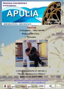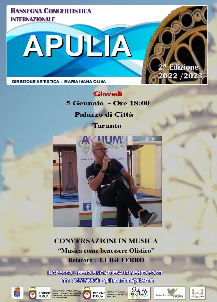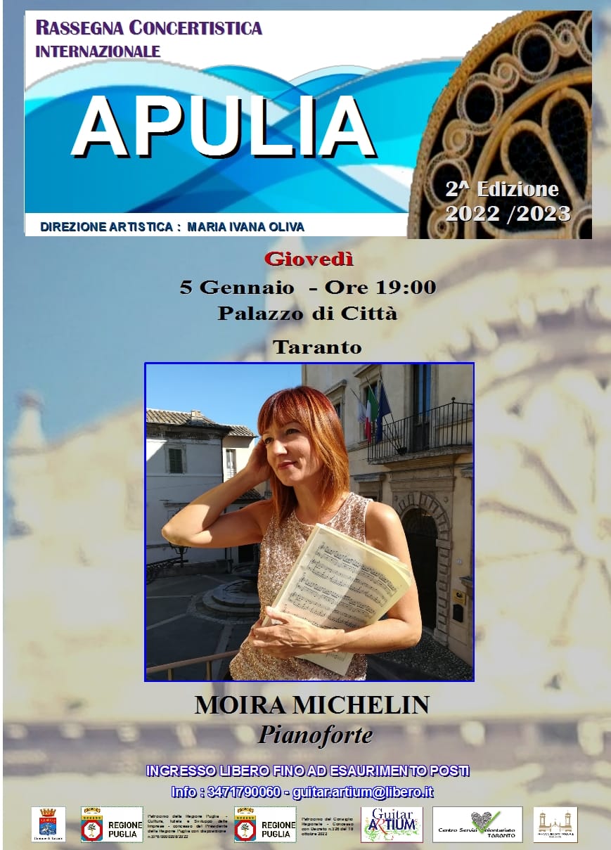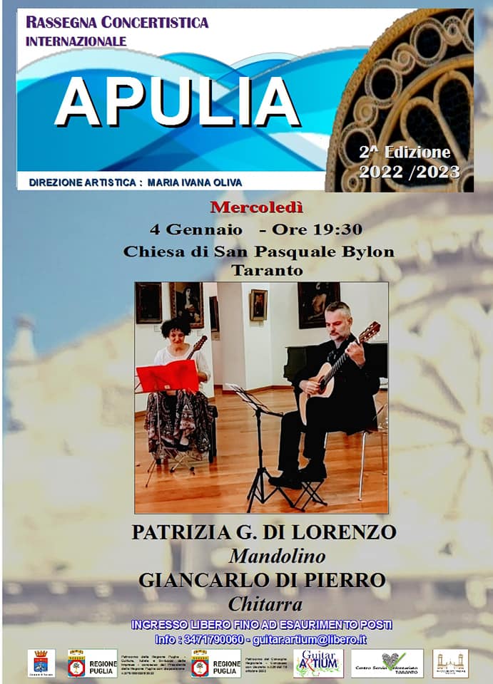 Questi i nuovi appuntamenti nell’ambito della seconda edizione della Rassegna Concertistica Internazionale “Apulia” nata da un’idea della dott.ssa Maria Ivana Oliva, Presidente dell’Associazione musicale “Guitar Artium”, sostenuta dal Comune di Taranto nonché patrocinata da Regione Puglia (Presidenza e Assessorato al Turismo) e CSV Taranto ETS.