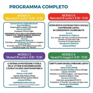 Il corso è rivolto a operatori e operatrici delle reti locali antidiscriminazione. Si tratta di un’occasione preziosa di formazione sul contrasto attivo all’omolesbobistransfobia e per il potenziamento delle competenze di chi opera nei servizi e delle reti locali antiviolenza, finalizzata alla costruzione di risposte efficaci e corrette rispetto ai bisogni di chi sperimenta condizioni di vulnerabilità a causa del proprio orientamento sessuale o dell’identità di genere.