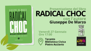 Il Coordinamento di Libera Taranto, in collaborazione con il M.S.A.C. Movimento Studenti di Azione Cattolica di Taranto, organizza per venerdì 27 gennaio, alle ore 17:00, presso la Biblioteca Civica “Pietro Acclavio” la presentazione del libro Radical Choc – Diritto alla salute, collasso climatico e biodiversità di Giuseppe De Marzo, economista, attivista e scrittore.