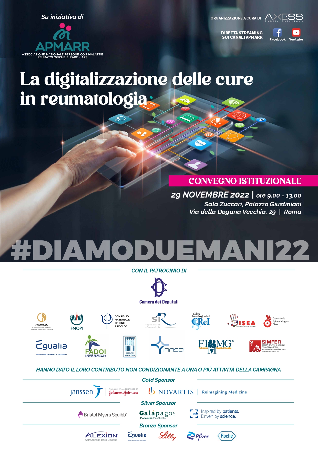 APMARR – Associazione Nazionale Persone con Malattie Reumatologiche e Rare organizza per martedì 29 novembre il convegno istituzionale La digitalizzazione delle cure in reumatologia, che si terrà a Roma presso la Sala Zuccari di Palazzo Giustiniani del Senato della Repubblica, dalle ore 9.00 alle 13.00.