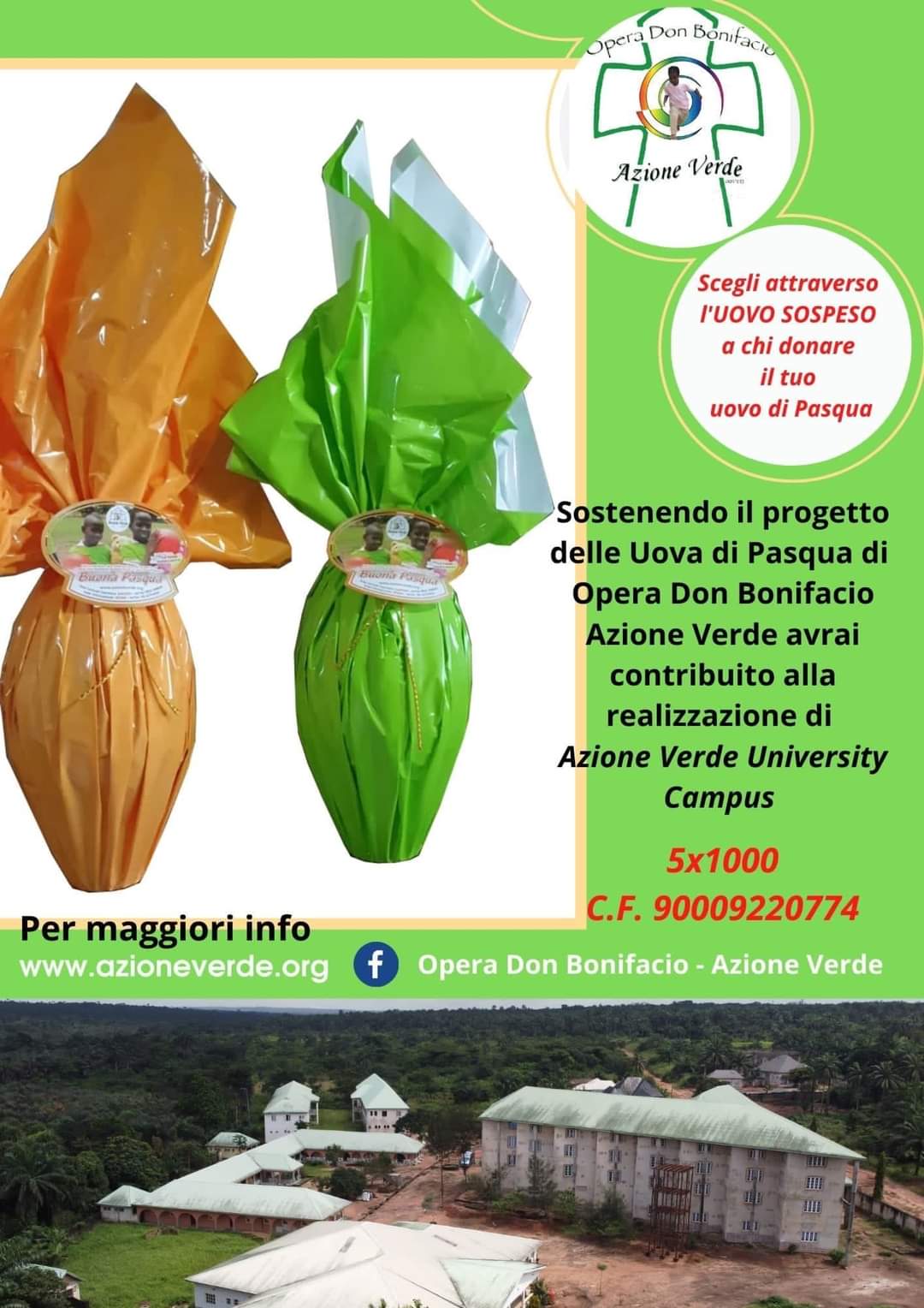 In occasione della Pasqua è possibile acquistare le Uova di cioccolato dell’Associazione Opera Don Bonifacio Azione Verde e contribuire così alla realizzazione di Azione Verde University Campus, struttura realizzata dall’associazione nel corso di 20 anni di attività che sorge su un’area di proprietà in estensione di oltre 75 ettari nel comune di Amaigbo in Nigeria e comprende facoltà universitarie, laboratori, mensa, aula magna, alloggi, centro sportivo, chiesa, biblioteca e poliambulatorio e sarà destinato a oltre 5000 studenti per offrire grandi opportunità di sviluppo umano attraverso programmi di studio e formazione universitaria.