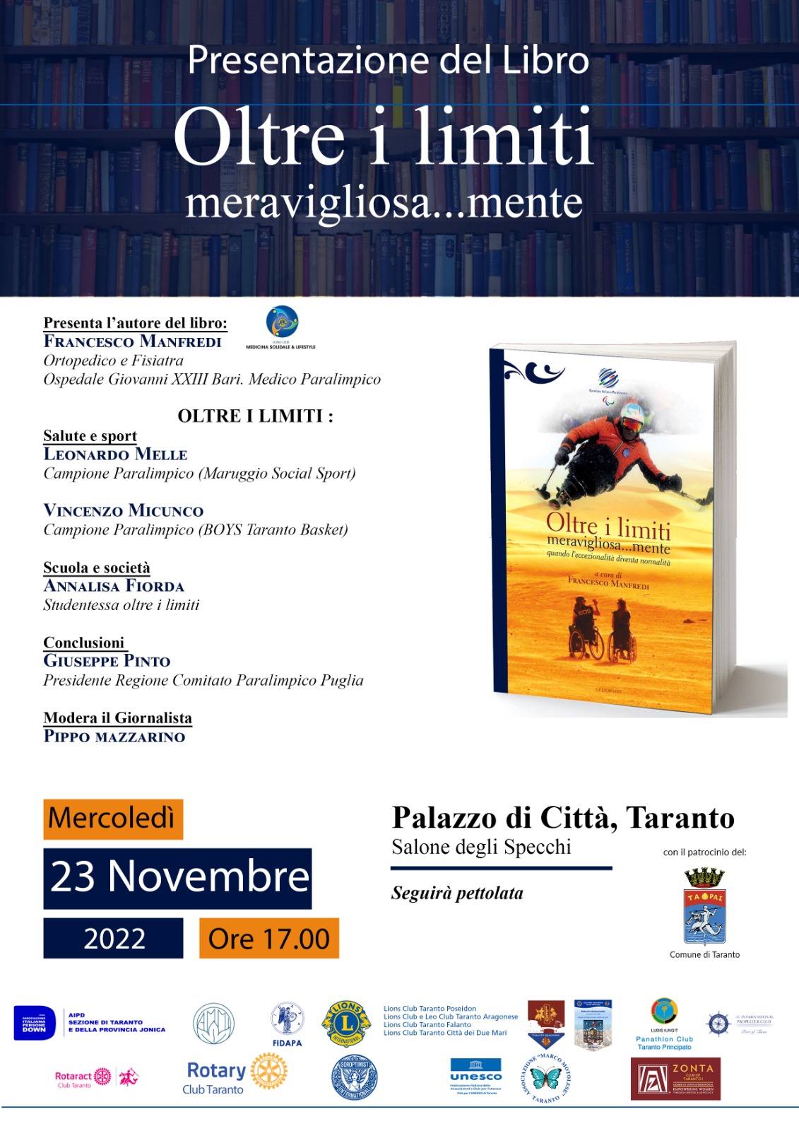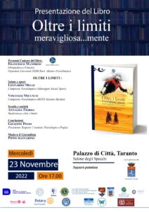 Sarà presentato mercoledì 23 novembre alle ore 17:00 nel Salone degli Specchi – Palazzo di Città il libro dal titolo OLTRE I LIMITI, MERAVIGLIOSA…..MENTE , il recente lavoro scritto da Francesco Manfredi a favore delle persone con grave disabilità nel convincimento che, seppur in condizioni di difficoltà, possono trovare e percorrere strade e andare “oltre i propri limiti “ con grandi risultati.