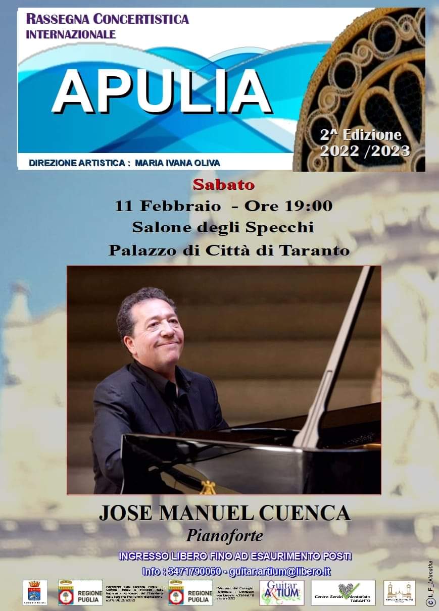 Per il prossimo appuntamento di sabato 11 febbraio è previsto un grande evento: il recital del pianista spagnolo andaluso, Manuel Cuenca che si esibirà alle ore 19.00 nella splendida cornice del Salone degli Specchi di Palazzo di Città di Taranto.