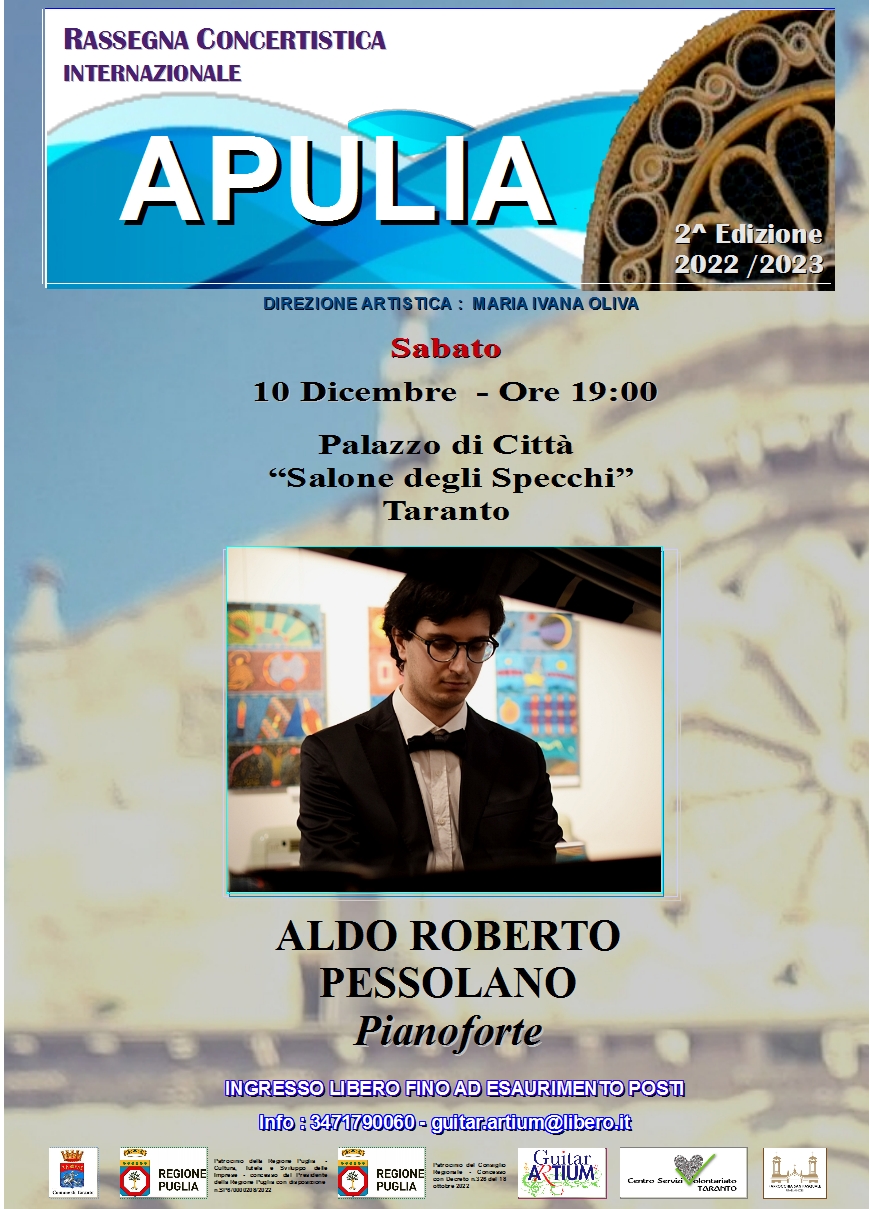 - sabato 10 dicembre alle ore 19.00 presso il Salone degli Specchi del Palazzo di Città di Taranto il concerto del pianista emergente Aldo Roberto Pessolano che eseguirà un programma con musiche di: Mozart, Mendelssohn, Chopin, Grieg, Liszt,