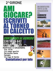 - 13 dicembre alle ore 16:30 presso i campi sportivi della Parrocchia Santa Famiglia in via Lago di Garda a Taranto la comunità Emmanuel organizza il 2° girone del torneo di calcetto. Per info e iscrizioni: 329/1005842 – 099/4521635