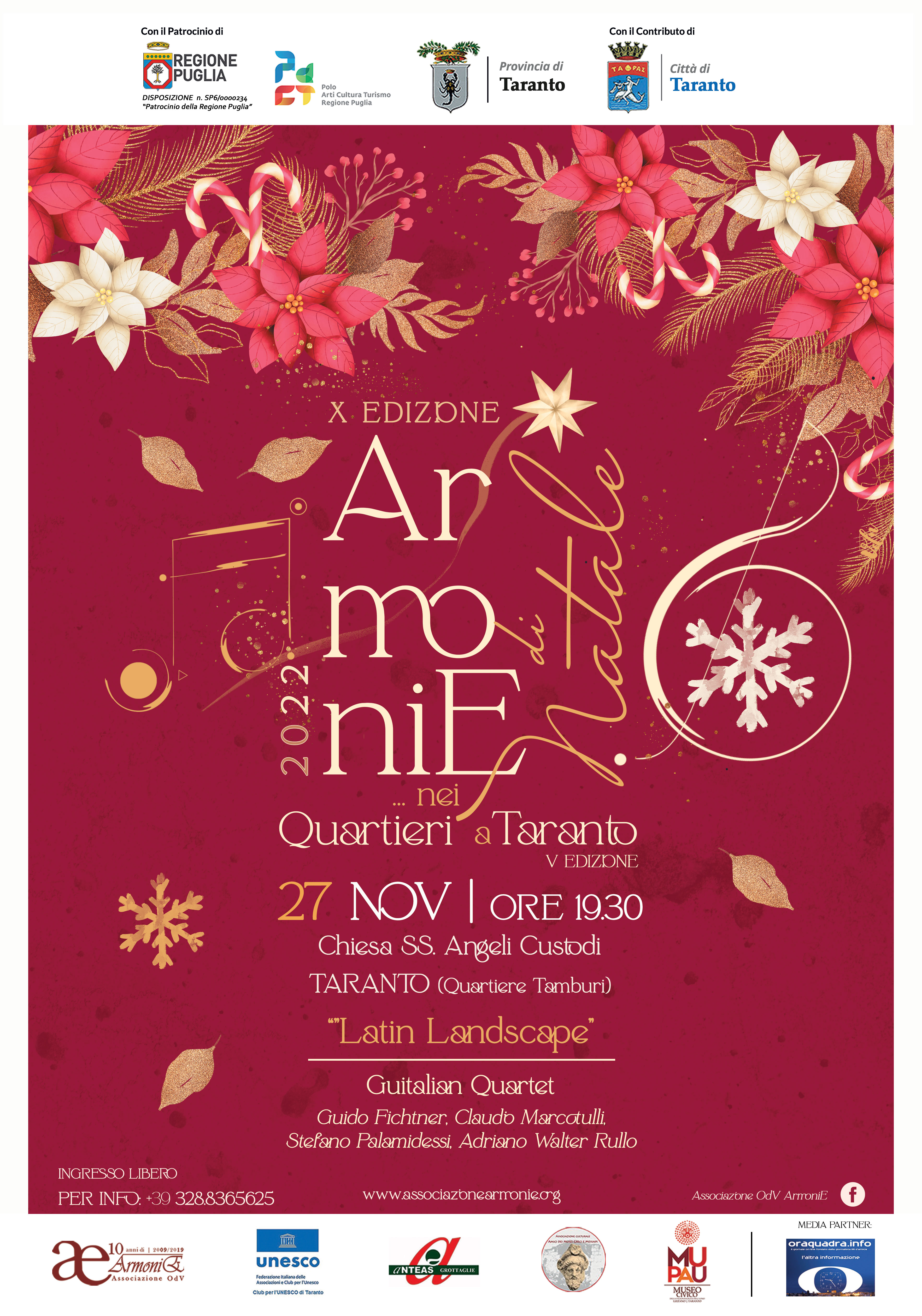 Domenica 27 novembre alle ore 19.30 nella Chiesa SS. Angeli Custodi al Quartiere Tamburi, il Guitalian Quartet composto dai chitarristi Guido Fichtner, Claudio Marcotulli, Stefano Palamidessi, Adriano Walter Rullo presenterà un programma dal titolo Latin Landscape che partirà dai classici Rossini e Bizet, per arrivare a G. Sollima e Tradizionali natalizi.