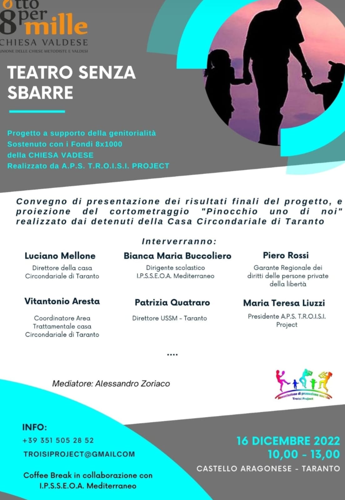 L’iniziativa, sostenuta con fondi 8×1000 della Chiesa Valdese, ha coinvolto otto detenuti della casa circondariale di Taranto con lo scopo di supportare la genitorialità in contesti complessi. In particolare ogni sforzo è stato proteso a responsabilizzare il genitore-detenuto per esortarlo a prendere coscienza del proprio ruolo di padre.