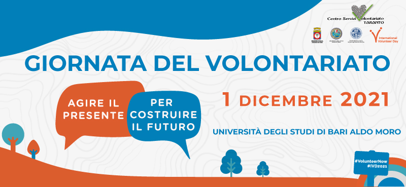 Mercoledì 01 dicembre, in occasione della 36^ Giornata Internazionale del Volontariato, il C.S.V. Taranto promuove, in collaborazione con l’Università degli Studi di Bari Aldo Moro – Dipartimento Jonico Sistemi Giuridici ed Economici del Mediterraneo: società, ambiente, culture (DJSGE) e con il patrocinio dell’Assessore al Welfare, Politiche di benessere sociale e pari opportunità, Programmazione sociale ed integrazione socio-sanitaria della Regione Puglia, la GIORNATA DEL VOLONTARIATO, che si terrà presso la sede dello stesso Dipartimento, in Via Duomo a Taranto.