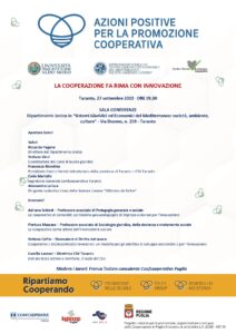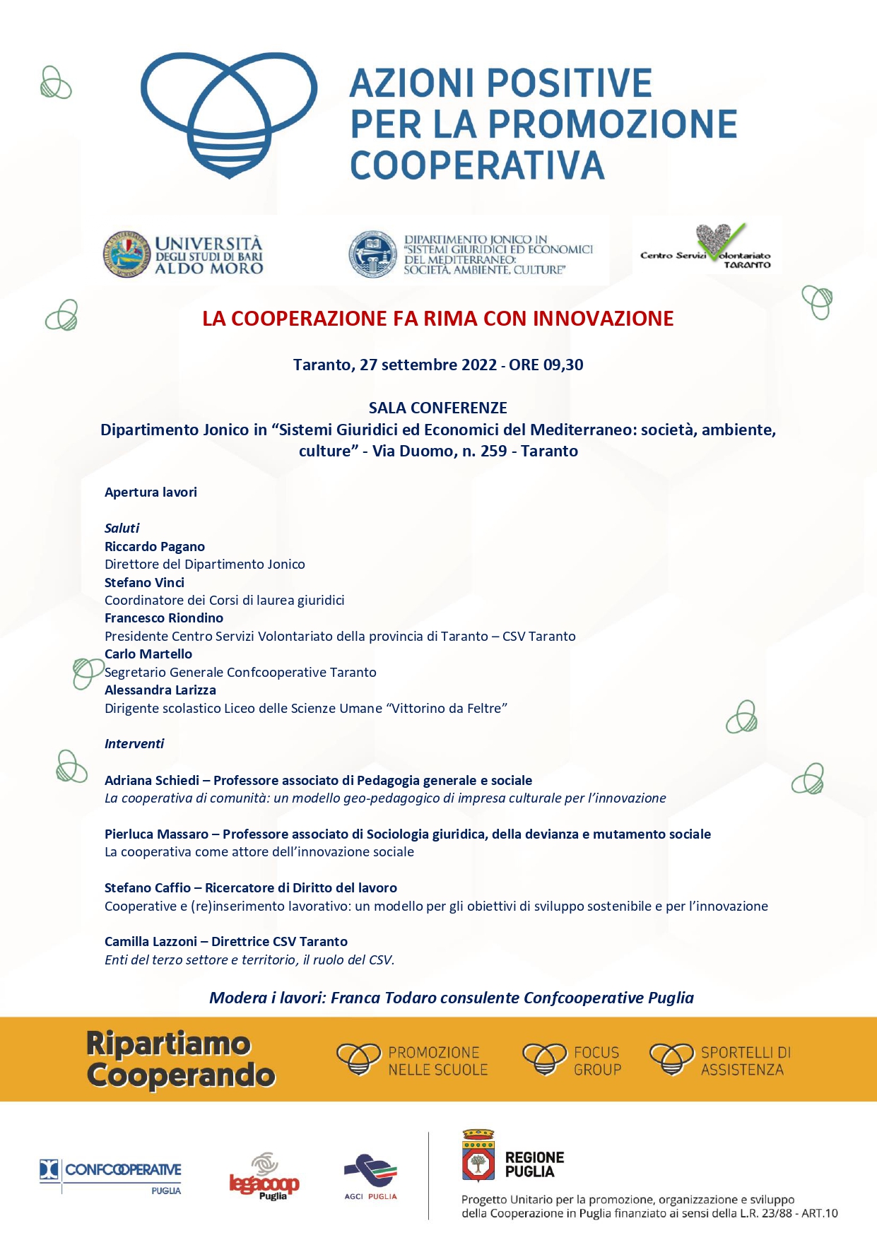Si svolgerà martedì 27 settembre alle ore 09,30 presso la Sala Conferenze del Dipartimento Jonico in “Sistemi Giuridici ed Economici del Mediterraneo: società, ambiente, culture” in Via Duomo, 259 a Taranto l’incontro sul tema La cooperazione fa rima con innovazione realizzato da Confcooperative Puglia in collaborazione con il con il DJSGE dell’Università degli Studi di Bari A. Moro e il CSV Taranto.