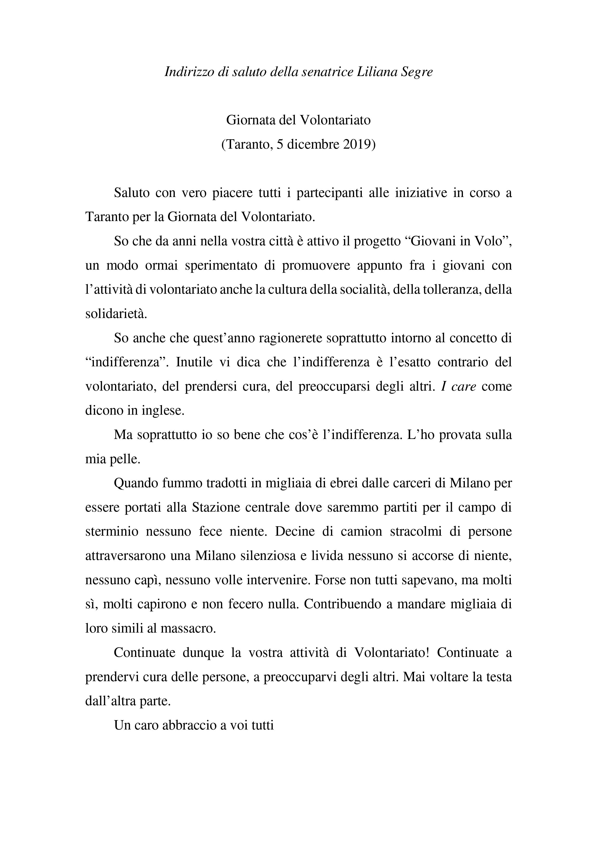 Il tema dell’indifferenza sarà approfondito attraverso le parole della senatrice Liliana Segre, la quale peraltro, impossibilitata ad accogliere l’invito del CSV a partecipare personalmente agli incontri, ha inviato ai giovani coinvolti nel progetto un suo messaggio.