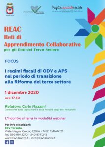 Il 01 dicembre p.v. si terrà un nuovo focus tematico nell’ambito del Progetto REAC – Reti di Apprendimento Collaborativo, nato nell’ambito di PugliaCapitaleSociale 2.0 – Linea B e finalizzato a rispondere sempre meglio, con attività integrative rispetto a quelle istituzionali svolte dal CSV Taranto sul territorio provinciale, al bisogno del mondo del Terzo Settore, e in particolar modo delle OdV e delle APS locali, di accrescere il proprio livello di conoscenza e competenza sulle nuove regole, sfide e opportunità derivanti dalla Riforma, nonché la propria capacità (capacity building) di incidere positivamente sulle dinamiche sociali e socio-economiche del territorio di riferimento.